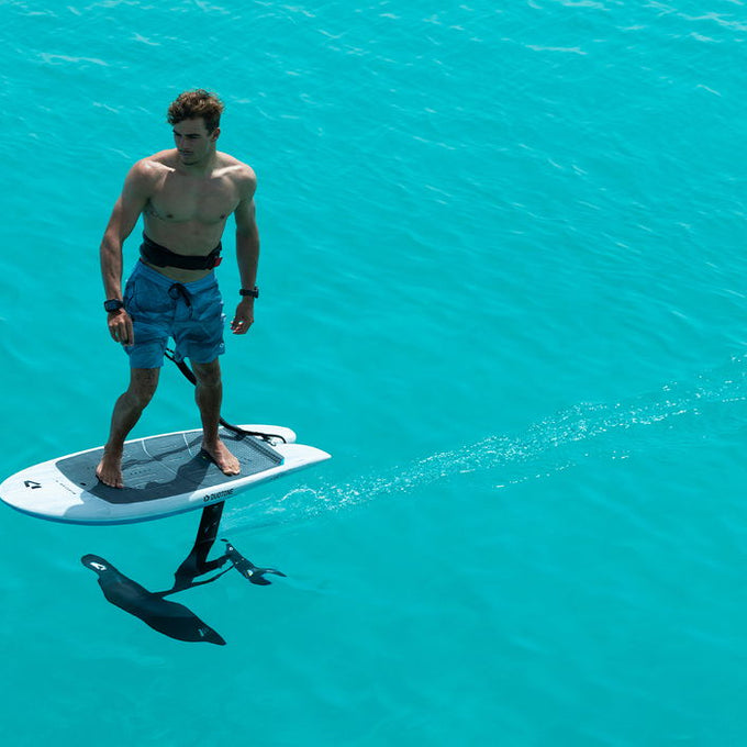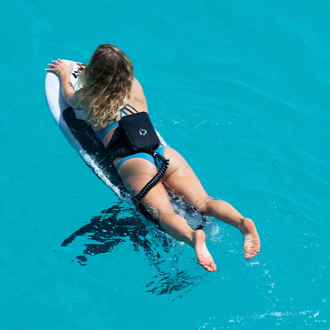 Le Foil Assist est alimenté par deux batteries compactes logées dans une boîte étanche fixée sur un eHarness léger (env. 3,76 kg). Cela permet de garder ta planche libre de poids supplémentaire et de traînée. Avec les batteries placées sur les hanches, la sensation naturelle et fluide du foil est préservée, tout en offrant une totale liberté de mouvement. L’eHarness est flottant et facile à retirer. Un câble longe proprement le leash plus court de la planche et relie les batteries à l’eMast. Le récepteur intégré dans la boîte à batterie assure une connexion stable et fiable entre la télécommande et le moteur tout au long de la session.