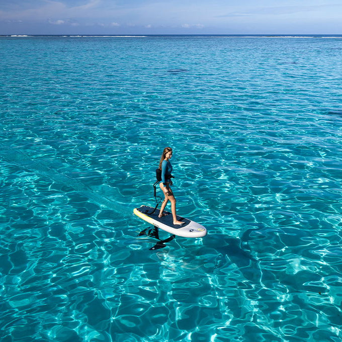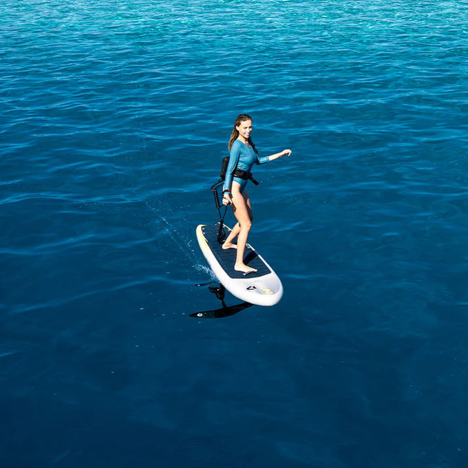 La Foil Assist Remote — une télécommande étanche de style montre connectée avec un anneau de doigt — garde tes mains libres, facilitant la rame ou la poussée sur la planche. Active le moteur avec un double clic sur le bouton +, puis contrôle la vitesse en maintenant le + ou le – appuyé.