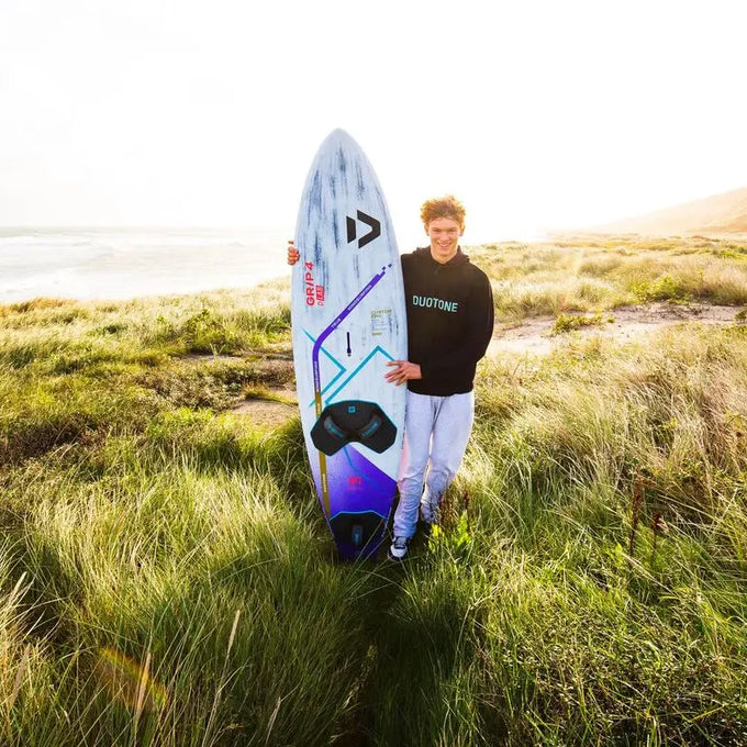 N‘est-ce pas exactement ce que nous attendons tous de notre planche de vagues? C’est la raison pour laquelle Marc et Victor sont nos plus grands atouts dans le processus de développement. En fait, toutes nos planches de production GRIP SLS sont des répliques exactes de leurs meilleures planches du circuit PWA. Maintenant, la question la plus importante que tu dois te poser c’est quelle est la configuration d’ailerons qui correspond le mieux à ton style de navigation: La GRIP 4 SLS, avec sa configuration d’ailerons en quad, t’offre un maximum de conduite et d‘accroche pour des virages engagés de rail à rail, même dans des vagues XXL. La GRIP 3 SLS a une accélération légèrement supérieure grâce à un rocker efficace avec une faible traînée, ce qui est particulièrement utile pour les sauts. La configuration des ailerons en thruster permet de libérer le tail plus rapidement pour des virages plus serrés et radicaux, même dans de petites vagues. Chez DUOTONE, nos objectifs principaux pour tous nos produits sont de diminuer le poids sans compromis sur la durabilité, et de proposer un matériel avec une configuration plug & play, car ce sont précisément les deux choses que tout le monde recherche, du débutant au champion du monde. Voici ce que nous avons fait pour la gamme GRIP SLS 2024: Pas de configuration multiple avec 5 boitiers d’ailerons: cela augmente inutilement le poids et la traînée et demande forcément de faire un compromis puisque chaque configuration d’ailerons exige un shape de planche différent (carène, rail, outline, ligne de scoop-rocker) pour exploiter pleinement son potentiel. Cela évite également que la planche ne devienne trop lourde/collante au niveau du tail. De plus, trouver la bonne configuration avec 5 boitiers c’est à l’opposé du plug & play. Le mini rail de mât diminue le poids dans la zone critique du nose. Il réduit également le risque de mal positionner ta plaquette tout en conservant une longueur d’ajustement suffisante pour tous les styles de navigation et tailles de voiles. Les mini boitiers d’ailerons latéraux ne proposent plus d’ajustement pour éviter de mal positionner ses ailerons. À présent, tous les réglages en fonction des différents styles de navigations et tailles de voiles se font au niveau de l’aileron central uniquement - simple et léger! Notre construction en sandwich exclusive, basée sur plus de 40 ans d‘expérience, a été peaufinée par le chef de produit DUOTONE, Dani Äberli, et le spécialiste de la mise en œuvre et responsable du contrôle de qualité, Vasin Siritho. Même les motifs ont été allégés en réduisant les lourds autocollants PVC. Tous ces efforts cumulés permettent de diminuer significativement le poids d’environ 400-500g (selon la taille de la planche) sans compromis sur notre excellente qualité: STRONG-LIGHT-SUPERIOR (SOLIDE-LÉGER-SUPÉRIEUR)! Ce sont des planches parfaites dès la première session, tu n’as qu’à connecter ta voile pour aller tout déchirer. Les nouvelles GRIP SLS sont prêtes et t’attendent pour passer au niveau supérieur!