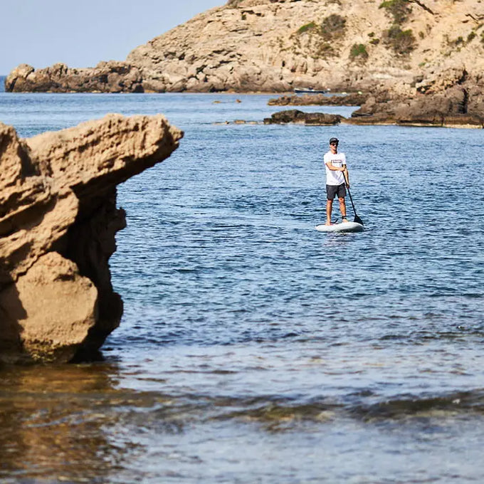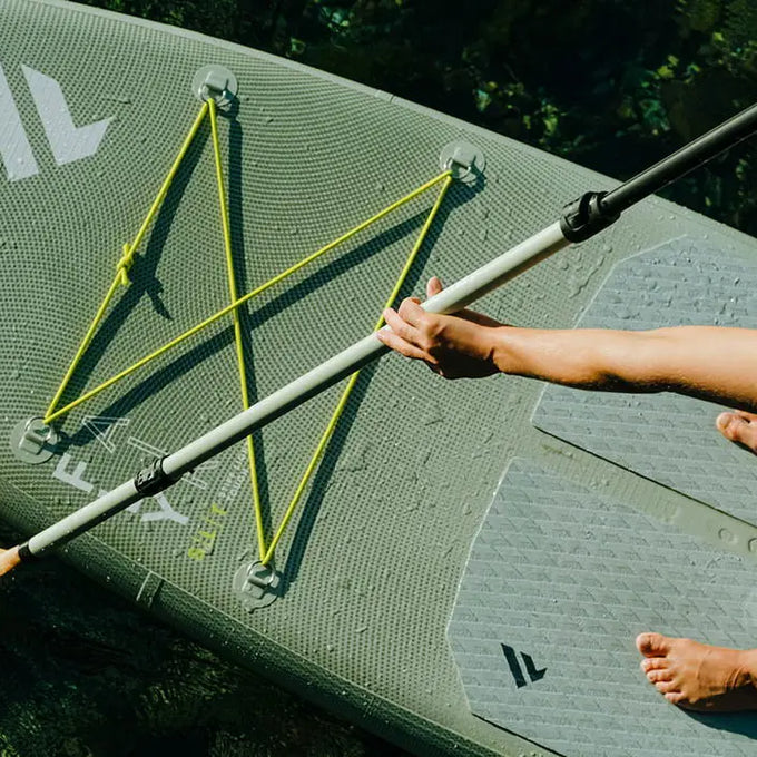 LA TAILLE COMPTE ! 2025 marque un tournant dans notre gamme de iSUP. Nos shapes testés et approuvés n’ont pas changé, mais nous avons complètement revu la construction. Tout a commencé par une grande enquête auprès de nos clients il y a plus de 2 ans, pour connaître les principaux facteurs d’achat. Même si nous avions déjà une idée assez précise, les résultats étaient frappants. Pour plus de 90 % des personnes, 2 éléments sont importants : le poids et la taille une fois rangé. Avec ces données en tête, nous avons développé un tout nouveau matériau avec notre fournisseur. Nous avons remplacé le matériau industriel standard par un tissu DropStitch sur toutes nos planches. Ce matériau est 20 % plus léger mais encore plus rigide. Il est également plus compact et facile à rouler. Tous les panneaux sont maintenant soudés et non plus collés. Cela améliore la durabilité de façon significative, tout en réduisant considérablement le poids grâce à la suppression de l’adhésif lourd. Pour finir, même le pad en EVA a été optimisé. La séparation supplémentaire au milieu permet de réduire encore le poids et de rouler de façon plus compacte. Le résultat final est vraiment stupéfiant : nos planches S | L | T sont probablement les iSUPs les plus légers et compacts sur le marché (jusqu’à 20 % plus légers que leurs prédécesseurs et 40 % plus compacts une fois rangés).
