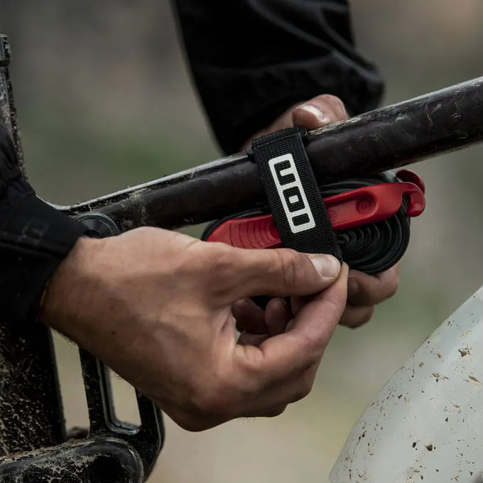Tout votre espace de rangement est déjà rempli de snacks, d'eau et de couches de vêtements supplémentaires ? Fixez facilement de petits équipements comme des chambres à air, des pompes pneumatiques ou de mini outils à votre cadre de vélo grâce à un système de sangle. Ce rangement est également pratique pour vous permettre d’aller au bike park sans sac à dos. Tout simplement parce que vous savez que forcer sur un vélo crevé c’est franchement pas le top.