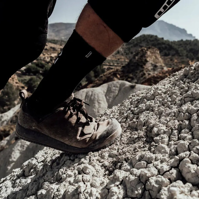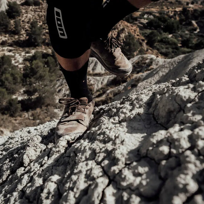 Développer de nouvelles chaussures, c’est comme améliorer sa recette préférée : on garde la même base en variant un peu les doses. Fidèle à l'image d’ION avec un mélange parfait d'accroche, de durabilité, de facilité d'utilisation et de style, la chaussure pour pédale plate continue d'évoluer. L’ingrédient principal, un concept de semelle Pin Tonic 2.0, est une nouvelle version plus délicieuse encore pour satisfaire tous les riders affamés de sorties à la journée. Le nouveau profil de semelle extérieure vient avec des accroches positives à l’avant-pied et au niveau du talon pour une traction parfaite en poussant ou lors du port de vélo. Les accroches négatives apportent une adhérence parfaite et de l’espace pour les picots. De plus, la SUPTraction est équipée d’un composé caoutchouc plus collant. Complètement changer la recette n’est pas toujours la bonne solution, la Scrub Select est équipée d’une semelle intermédiaire confortable en EVA et d’une semelle intérieure Ortholite Eco Plush. L'accroche n’étant qu’un composant de la transmission de puissance, la zone complètement à l’avant des orteils dispose d'une partie plus basse pour un contact maximal sur la pédale. L'accroche ne suffit pas pour obtenir une bonne chaussure de vélo, c’est pourquoi celles-ci disposent d’une protection contre les pierres et les racines au niveau des orteils et protègent les chevilles des manivelles (Ankle_Pad). Le Velcro sur le dessus est là pour montrer que vous avez du goût, mais sert également pour un réglage individualisé. L’ingrédient principal de la Scrub Select est du cuir véritable, bon pour le style ainsi que l’aération, le confort et la durabilité.